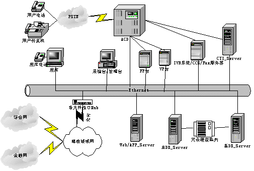 呼叫中心的功能主要有兩方面,一是與用戶進行交互,另外與金融主機房進行數據交互。呼叫中心系統(tǒng)由兩部分組成:聲訊平臺(CALL CENTER)和業(yè)務數據計算機網絡平臺。聲訊平臺由話務接入設備(ACD)、IVR系統(tǒng)和CTI服務器組成,主要負責語音資源的管理、呼入話務的排隊、自動業(yè)務以及人工座席的管理等;業(yè)務數據計算機網絡平臺是對業(yè)務數據的收集、使用、管理、分析等。平臺間通過CTI技術實現數字數據和語音數據的相互轉換和同步轉移。系統(tǒng)結構如下。