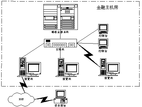 郵政儲蓄金融主機房主要包含金融主機、前置機及網絡通信設施。其結構示意圖如下。
