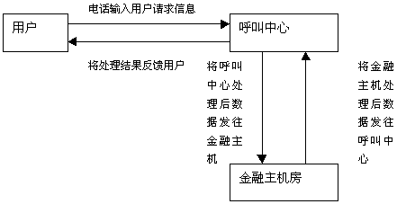用戶通過撥打電話185連接到185客戶服務中 心,然后根據客戶服務中心的提示信息利用電話按鍵或語音輸入用戶的請求信息。用戶的請求信息傳送到呼叫中心后,呼叫中心會根據用戶的請求信息內容進行處理,如查詢儲蓄法規(guī)等,然后將處理結果反饋給用戶,如果牽涉到用戶的帳戶數據,則呼叫中心將用戶的請求首先進行處理,然后將處理后的信息發(fā)送給金融主機房,由金融主機根據呼叫中心傳來的數據進行帳務處理,然后將處理結果返回給呼叫中心,呼叫中心再對金融主機房返回的數據進行處理成客戶能夠聽到的語音信息,將處理結果傳給用戶。上述流程是一個單個處理流程,實際上跟用戶進行交互時,一項業(yè)務會有多個往返的處理流程。