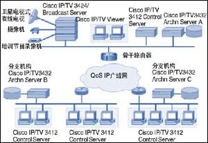在企業(yè)總部配置Cisco IP/TV 3424或3425視頻廣播服務(wù)器,可以對(duì)公司的培訓(xùn)進(jìn)行現(xiàn)場(chǎng)攝像的同時(shí),將這些節(jié)目通過網(wǎng)絡(luò)進(jìn)行現(xiàn)場(chǎng)直播。因?yàn)槭褂肐P組播多點(diǎn)發(fā)送技術(shù),廣播服務(wù)器可以進(jìn)行現(xiàn)場(chǎng)直播,在一路節(jié)目占據(jù)一個(gè)帶寬流的情況下,將此節(jié)目發(fā)送到企業(yè)范圍內(nèi)的各個(gè)分支機(jī)構(gòu),減少了對(duì)網(wǎng)絡(luò)資源的額外占用。IP/TV廣播服務(wù)器支持廣泛的CODEC:從高質(zhì)量的MPEG-1(500kbps-1.5Mbps)及中質(zhì)量的H.261(128kbps-500Kbps)到低比特率的56kbps視頻,都可以充分滿足質(zhì)量與帶寬的要求。在總部配置Cisco