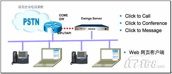 UC點(diǎn)點(diǎn)通解決方案,由網(wǎng)關(guān),服務(wù)器,IP電話和客戶端組成,如圖5所示: