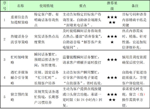 。1)策略內(nèi)容:突發(fā)話務(wù)往往導(dǎo)致瞬間話務(wù)高峰,如能將瞬間話務(wù)“均衡化”,則可有效避免“話務(wù)雪崩”,為此通過錄制IVR語(yǔ)音,引導(dǎo)客戶閑時(shí)再撥!臼纠俊白鹁吹目蛻,目前人工話務(wù)繁忙,為節(jié)省您的時(shí)間,建議您4小時(shí)后再行撥打。給您帶來(lái)不便,我們深表歉意”。
