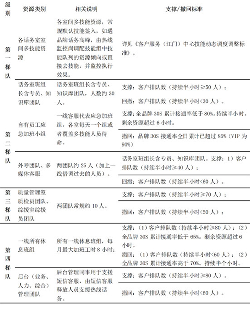 第一梯隊(duì):側(cè)重現(xiàn)有話務(wù)科室間“技能協(xié)同”,適度放棄某些品牌,重點(diǎn)保障某品牌;同時(shí)一線班組長(zhǎng)和日常負(fù)責(zé)業(yè)務(wù)知識(shí)管理的同事入線,承接普通話務(wù)。