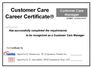學員在經(jīng)過完整的課程培訓之后,經(jīng)考試合格,可以獲得由美國俄亥俄州立大學與太維資訊有限公司聯(lián)合頒發(fā)的的專業(yè)培訓證書?蛻舴⻊罩行恼J證的目的有兩個:首先,對于已經(jīng)在客服中心從業(yè)的人員,太維公司的培訓可以提供一個提升他們工作能力的機會,通過培訓后不同層次的專業(yè)培訓認證,太維公司以行業(yè)的標準要求對他們的提升加以證明,以加強他們在行業(yè)中的競爭能力。其次,對于有志致力于在客戶服務行業(yè)從業(yè)的人事,太維公司廣泛深入、滿足各種需求的專門技術培訓與相應的不同層次的認證,為他們進入該行業(yè)提供一個標準的素質證明,以使他們能夠順利勝任客戶服務中心的各種主要的工作職位。