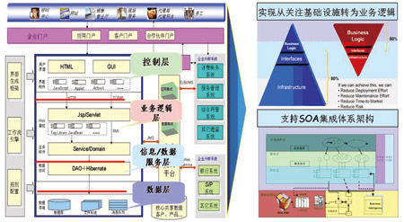在企業(yè)應(yīng)用集成上,產(chǎn)品采用了面向服務(wù)的組件化設(shè)計,遵循SOA體系架構(gòu),既支持基于服務(wù)的企業(yè)IT系統(tǒng)在數(shù)據(jù)、服務(wù)、流程等各個層面有效協(xié)同,也支持對各種遺留系統(tǒng)采用各種傳統(tǒng)的接口方式進(jìn)行集成。