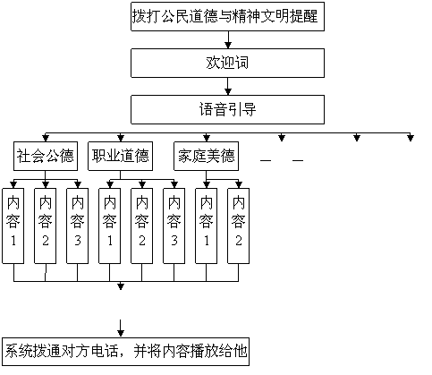 例如,某位公民對(duì)他(她)的鄰居或者同事一些不文明的行為(如深夜打麻將,亂倒垃圾,不講衛(wèi)生,破壞公物……)感到有必要進(jìn)行善意的提醒,但是,又覺得直接對(duì)他(她)說不合適,因?yàn)楫吘闺p方很熟悉或者還要共事,如果直接對(duì)對(duì)方進(jìn)行批評(píng)可能會(huì)引起對(duì)方的反感,即使對(duì)方認(rèn)為自己做的不對(duì),也會(huì)感到很尷尬,很失面子,在這種情況下,這為公民可以撥打“社區(qū)道德與精神文明提醒熱線”,選取熱線內(nèi)預(yù)先已經(jīng)錄制好,經(jīng)過審定的錄音內(nèi)容,選取內(nèi)容后輸入對(duì)方的電話號(hào)碼,熱線系統(tǒng)就可以將這段錄音播放給對(duì)方聽,對(duì)方聽到之后就會(huì)意識(shí)到或者思考自己的行為里面有沒有不文明的行為,同時(shí)會(huì)相應(yīng)的約束自己的行為。但是在此過程中對(duì)方并不知道為他(她)點(diǎn)播這段錄音的人的電話號(hào)碼,從而也不知道是誰(shuí)給她留的錄音。當(dāng)然,還可以通過電子郵件或者手機(jī)短消息的方式對(duì)他(她)進(jìn)行提醒。