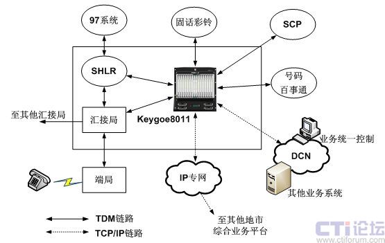 東進(jìn)Keygoe系列多媒體交換機(jī)通過高密度7號信令鏈路支持、大容量的時隙交換、多網(wǎng)絡(luò)接口和語音處理完成不同業(yè)務(wù)系統(tǒng)的7號信令的接續(xù)和解析、話音交換和協(xié)議轉(zhuǎn)換。對于已經(jīng)進(jìn)行固網(wǎng)智能改造的電信網(wǎng)絡(luò),可以在匯接局將各種業(yè)務(wù)平臺連接至東進(jìn)Keygoe系列多媒體交換機(jī),并通過東進(jìn)Keygoe系列多媒體交換機(jī)連接至SHLR,實現(xiàn)多業(yè)務(wù)平臺上的多業(yè)務(wù)觸發(fā),同時通過SHLR與97系統(tǒng)以及其他業(yè)務(wù)支撐系統(tǒng)連接起來,實現(xiàn)業(yè)務(wù)的統(tǒng)一批價、鑒權(quán)和計費;對于沒有進(jìn)行固網(wǎng)智能化改造的電信網(wǎng)絡(luò),可以在匯接局通過東進(jìn)Keygoe系列多媒體交換機(jī)和SSP提供基于TCP/IP層面的業(yè)務(wù)平臺互聯(lián)。
