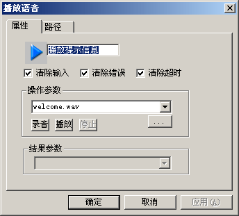并不是所有的模塊都有操作參數(shù)和結(jié)果參數(shù),有些模塊可能只有其中的一個,有些模塊兩個參數(shù)都沒有。例如:播放語音模塊必需有操作參數(shù)--要播放的語音文件的文件名,但它沒有結(jié)果參數(shù);存儲變量模塊必需有結(jié)果參數(shù)--變量名,但它沒有操作參數(shù);運算模塊既有操作參數(shù),也有結(jié)果參數(shù);取消轉(zhuǎn)隊列模塊和退出模塊則沒有參數(shù)。