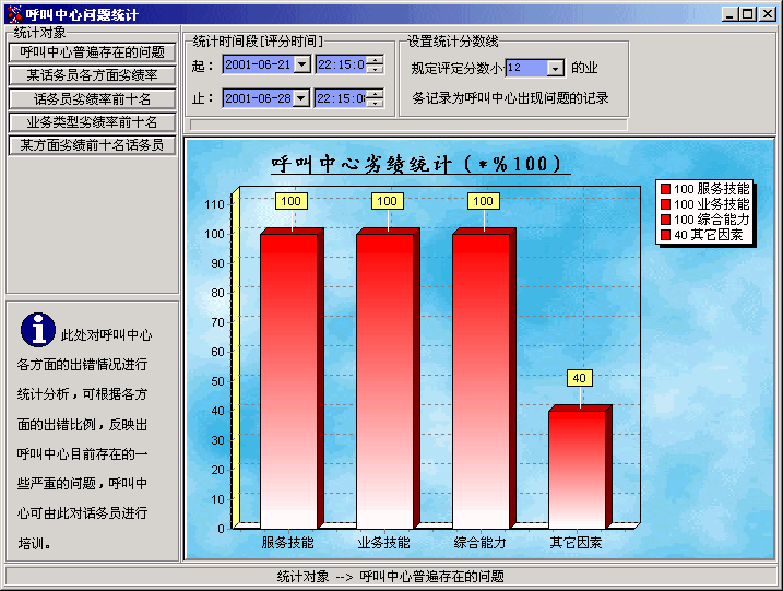 下圖為AP Suite的呼叫中心劣績統(tǒng)計圖,通過此統(tǒng)計可以了解到呼叫中心目前存在的一些問題,從而對話務(wù)員進(jìn)行針對性的培訓(xùn)。