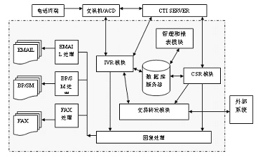 客戶服務(wù)中心系統(tǒng)由智能排隊(duì)機(jī)(含接入服務(wù)器)、核心服務(wù)器CTI、交互式語(yǔ)音應(yīng)答系統(tǒng)IVR、語(yǔ)音傳真服務(wù)器、業(yè)務(wù)服務(wù)器、工作流服務(wù)器、數(shù)據(jù)庫(kù)服務(wù)器、Internet/Intranet服務(wù)器、人工座席、尋呼機(jī)接口、手機(jī)短消息接口等組成。
