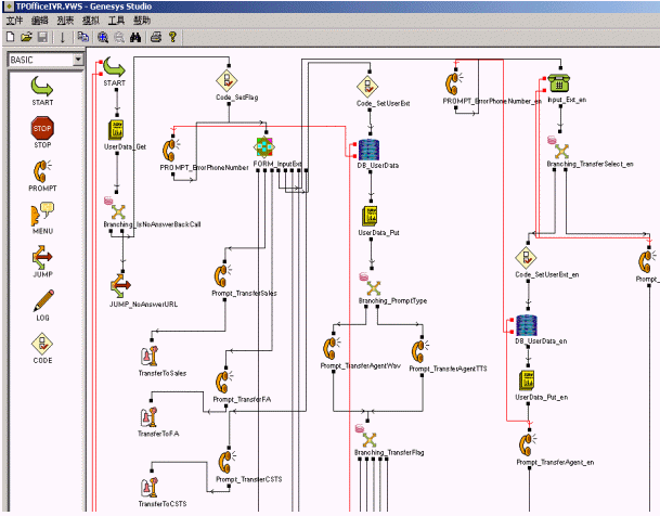 GVP提供了界面友好的功能強(qiáng)大的語音應(yīng)用開發(fā)工具-Genesys Studio,其中預(yù)定了豐富的控件,用來實(shí)現(xiàn)菜單語音播報(bào)、DTMF收集以及對(duì)數(shù)據(jù)庫(kù)查詢等諸多功能。通過拖放的方式就可以快速的隨心所欲地設(shè)計(jì)出你所需要的語音邏輯應(yīng)用流程,最終編譯產(chǎn)生用于發(fā)布的ASP或者JSP頁面。應(yīng)用之間可以彼此調(diào)用,提高了語音應(yīng)用的靈活性和可重用性。Genesys Studio還提供了靈活實(shí)用的調(diào)試工具,可以隨意設(shè)置斷點(diǎn)實(shí)時(shí)跟蹤流程的執(zhí)行情況,極大的方便了語音應(yīng)用流程的調(diào)試。