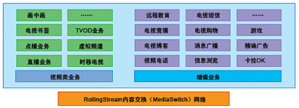 奔流(RollingStream)系統(tǒng)不僅僅支持以LiveTV、Timeshift-TV、VOD、TVOD等為基礎(chǔ)的各項(xiàng)功能,而且具有良好的功能上的可擴(kuò)展性,在此平臺(tái)上可以支持眾多豐富多彩的增值互動(dòng)業(yè)務(wù);诒剂(RollingStream)具有無限的業(yè)務(wù)增長空間,如下圖所示意: