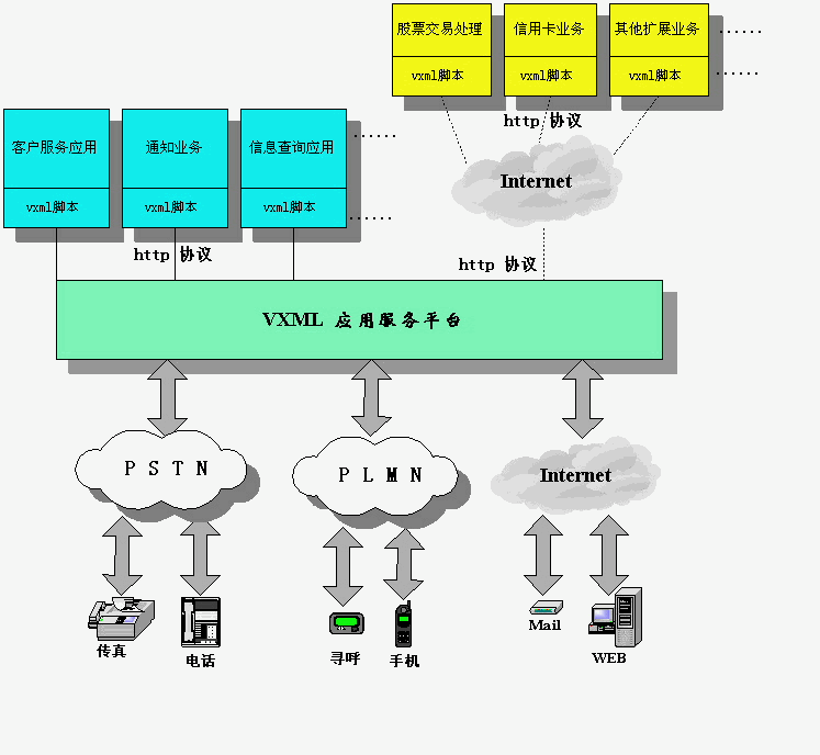 2000年3月由AT&T,Lucent,Motorola,IBM四家公司發(fā)起并提出的VoiceXML標(biāo)準(zhǔn)語(yǔ)言為語(yǔ)音增值業(yè)務(wù)的發(fā)展帶來了新的生機(jī)和變化。由于VoiceXML是XML語(yǔ)言的分支和子集,因此天然可以與因特網(wǎng)無縫連接。這使得傳統(tǒng)的語(yǔ)音業(yè)務(wù)可以無限擴(kuò)展到龐大的互聯(lián)網(wǎng)體系中,可以真正“讓我們用聲音傾聽互聯(lián)網(wǎng)”。