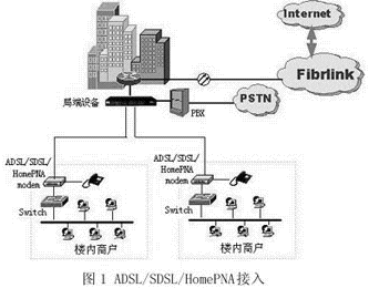 ADSL、SDSL、HomePNA接入方法都是利用普通電話線,采用頻分復用等技術,將電話線分成多個傳輸通道進行通信,它適用于無綜合布線的建筑物。這三種接入方式都可以在同一電話線上同時傳輸數(shù)據(jù)和語音。ADSL技術在一條電話線上最多可以實現(xiàn)上行1M、下行8M的不對稱高速數(shù)據(jù)傳輸;SDSL在一條電話線上能達到2M的上下行對稱傳輸速率,并且可以將多條電話線捆綁,實現(xiàn)2M、4M、6M、8M等多種傳輸速率;HomePNA在一條電話線上能達到1M的上下行對稱傳輸速率,尤其適用于小型企業(yè)和家庭用戶。以太網(wǎng)接入主要適用于有綜合布線,共享帶寬接入的情況,一般在樓內(nèi)機房配置出口路由器和交換機,在每層配置樓層交換機,將用戶直接連接到10/100M交換機端口,實現(xiàn)10/100M帶寬到桌面。如圖1所示。