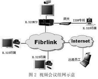 目前視頻會議系統(tǒng)主要有兩大類:一種基于H.320協(xié)議標準,另一種基于H.323協(xié)議標準。H.320會議系統(tǒng)技術成熟,運行穩(wěn)定,圖像質(zhì)量高,但業(yè)務功能單一,組網(wǎng)不夠靈活;H.323會議系統(tǒng)是最近兩年興起的視頻會議系統(tǒng),運行在廣泛存在的IP網(wǎng)絡之上,以功能豐富、組網(wǎng)方便靈活等為主要特征,成為視頻會議系統(tǒng)的發(fā)展方向,但其視頻質(zhì)量很大程度上依賴于所承載的IP網(wǎng)絡的質(zhì)量。中電飛華公司基于FibrLINK平臺,為用戶提供H.320、H.323以及H.320和H.323混合組網(wǎng)的視頻會議系統(tǒng)建設,如圖2所示。