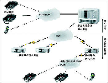目前,根據(jù)建設(shè)思路中所提到的分期實(shí)施原則,第一期只完成本地多方電話會(huì)議中心平臺(tái)的建設(shè)。參加電話會(huì)議的各方用戶均直接通過公眾電話網(wǎng)撥入中心平臺(tái),由中心平臺(tái)統(tǒng)一接入并組織會(huì)議資源為用戶服務(wù),結(jié)構(gòu)如圖2所示。