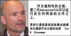 “目前我們是業(yè)內(nèi)第一家推出第二代AdvancedTCA產(chǎn)品的廠家”,英特爾通信基礎(chǔ)設(shè)施事業(yè)部模塊化通信平臺(tái)分部(MCPD)總經(jīng)理Ton
