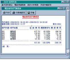 - 每種電話明細(xì)報(bào)表皆有提供通話日期、時(shí)間、外線號(hào)碼、外撥電話號(hào)碼、外撥電話類別、通話通數(shù)、通話時(shí)間、通話金額、外撥區(qū)域之資料,而且還提供資料匯總。