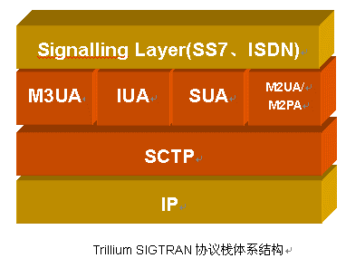 如圖所示,Trillium可提供完整的SIGTRAN協(xié)議棧解決方案,包括SCTP、M3UA、M2UA、M2PA、SUA、IUA,其共同的特點如下: