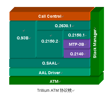 Trillium提供完整的ATM協(xié)議棧,同時(shí)支持ITU和ATM Forum的標(biāo)準(zhǔn),相關(guān)產(chǎn)品包括AAL2 Signalling(Q.2630.1、Q.2150.1和Q.2150.2)、Q.93B(Q.2931)、Q.2140、Q.SAAL(Q.2130、Q.2110)、B-ISUP、VTOA、IME(ILMI 4.0)、PLOA(包括IPoA)、PNNI等。