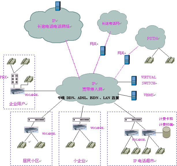 ISP及寬帶網(wǎng)絡(luò)運(yùn)營商的本地電話接入網(wǎng)絡(luò),采用單級單域結(jié)構(gòu),在網(wǎng)內(nèi)安裝VIRTUALSWITCH虛擬交換系統(tǒng),它作為整個本地電話接入網(wǎng)絡(luò)的網(wǎng)守,以集中方式管理域內(nèi)的所有網(wǎng)關(guān)(VOCA-BOX),執(zhí)行地址翻譯,呼叫控制,帶寬管理,域管理等功能以及呼叫建立、拆除控制和呼叫管理等功能。在網(wǎng)內(nèi)安裝后臺計(jì)費(fèi)、認(rèn)證系統(tǒng)(VBMS),對各個語音終端實(shí)現(xiàn)計(jì)費(fèi)認(rèn)證及結(jié)算,同時完成號碼分配及網(wǎng)絡(luò)管理的功能。