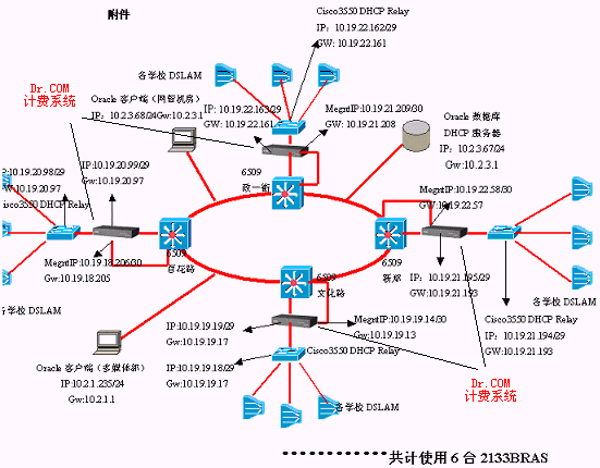1). 運(yùn)營(yíng)支撐系統(tǒng): Dr.COM2133計(jì)費(fèi)管理系統(tǒng)(6臺(tái)2133BRAS+1套OSS運(yùn)營(yíng)平臺(tái))