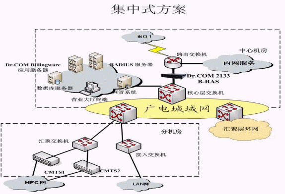 根據(jù)廣電城域網(wǎng)目前網(wǎng)絡的規(guī)模,以及以后的擴展,采用集中接入認證與計費,統(tǒng)一管理的方案,集中接入指:接入服務器部署在各個匯聚層的匯聚點,即在網(wǎng)絡出口安裝寬帶接入服務器,由寬帶接入服務器對所有用戶進行身份認證、接入控制、實時計費、數(shù)據(jù)采集,并將賬單和訪問日志等傳送至綜合業(yè)務系統(tǒng)。統(tǒng)一管理指在中心機房就可以進行全部的管理,包括:網(wǎng)絡設備管理;用戶管理;經營策略管理;賬務管理;安全管理;數(shù)據(jù)分析。提供完整的用戶資料分析,使用習慣分析,運營統(tǒng)計等詳細分析報表。