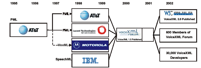 VoiceXML 是由IBM 、Lucent、Motorola 和AT&T 四家公司于2000年提出的一種應(yīng)用于語音瀏覽的標(biāo)記語言。如下圖所示,VoiceXML是各廠商多年經(jīng)驗(yàn)積累的產(chǎn)物,VoiceXML