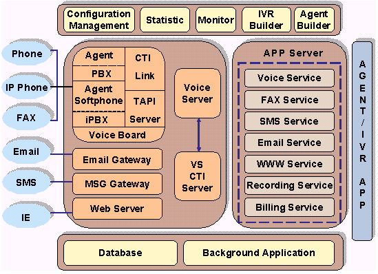 Server負責將這些信息收集在一起,供應用服務器使用;同時VoiceServer和CTI Server同時將各種數(shù)據(jù)和信息進行解釋,將任務提交給各種硬件和接入設備執(zhí)行。