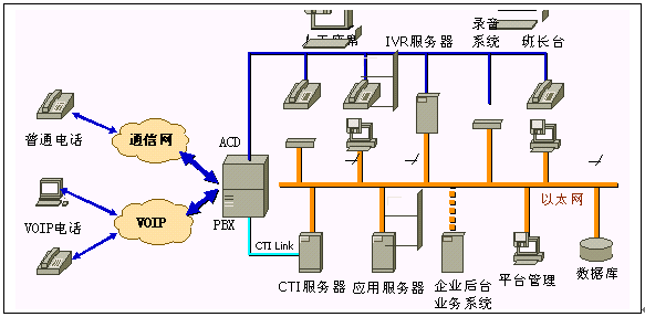 ·PBX/ACD:實現(xiàn)電話呼入、呼出和話務(wù)管理等功能,提供自動排隊機系統(tǒng),實現(xiàn)對來話的均衡分配