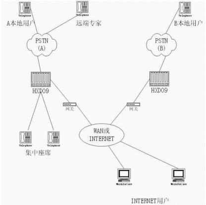 通過HXD09智能型可編程交換機(jī)構(gòu)建分布式呼叫中心(一個(gè)主呼叫中心,多個(gè)分呼叫中心),IPV 實(shí)現(xiàn)語(yǔ)音的遠(yuǎn)程傳輸;實(shí)現(xiàn)遠(yuǎn)程專家咨詢、集中管理座席的功能,其方式如下圖所示: