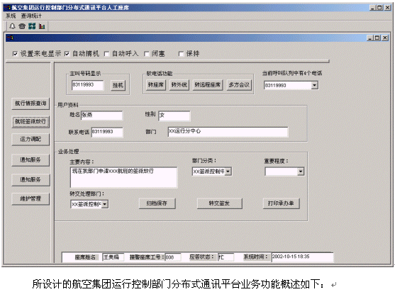 航空集團(tuán)運(yùn)行控制部門分布式通訊平臺(tái)將接入功能、導(dǎo)航功能、自動(dòng)語(yǔ)音查詢功能、人工座席服務(wù)功能、話路轉(zhuǎn)接功能、信息資料處理緊密聯(lián)系起來(lái)。本地或異地有關(guān)部門/工作人員撥打特服電話號(hào)碼后,可以根據(jù)需要選擇人工服務(wù)、自動(dòng)語(yǔ)音查詢、自動(dòng)留言,并能夠在幾種服務(wù)中來(lái)回切換或轉(zhuǎn)接其它電話,也可以路由到遠(yuǎn)程座席;所記錄的資料可以分門別類的進(jìn)行統(tǒng)計(jì)并形成報(bào)表,供相關(guān)部門進(jìn)行檢索查閱;意見處理完畢,可由人工座席主動(dòng)呼叫本地或異地有關(guān)部門/工作人員,告知處理意見,形成閉環(huán)處理流程;可定期進(jìn)行信息歸納、推演、預(yù)測(cè)等,從而得到信息深加工品。