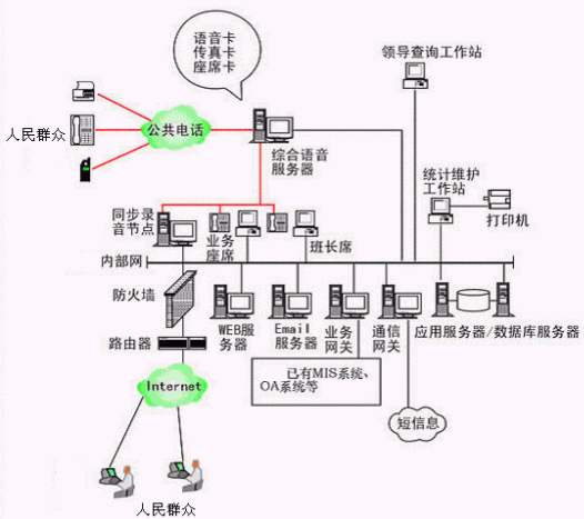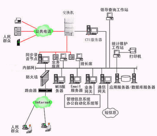本系統(tǒng)物理結(jié)構(gòu)由排隊交換機、CTI服務(wù)器、IVR(交互式語音應(yīng)答)/IFR(交互式傳真應(yīng)答)服務(wù)器、業(yè)務(wù)代表座席(邏輯上分為:普通業(yè)務(wù)代表座席、專家座席、WEB座席等)、班長座席、統(tǒng)計維護管理工作站、因特網(wǎng)(WEB)服務(wù)器、電子郵件(EMAIL)服務(wù)器、數(shù)據(jù)庫/應(yīng)用服務(wù)器、錄音留言工作站、領(lǐng)導(dǎo)查詢工作站、業(yè)務(wù)網(wǎng)關(guān)服務(wù)器、通信網(wǎng)關(guān)、網(wǎng)絡(luò)系統(tǒng)等和應(yīng)用軟件構(gòu)成。
