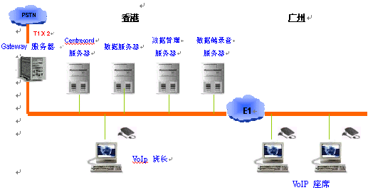 于本年一月初,基于Concerto Software平臺(tái)建設(shè)的中港跨境呼叫中心正式由本公司替GIS于香港及廣州開通。初期于廣州之座席數(shù)目為24。廣州與香港間透過1條E1專線連接。(結(jié)構(gòu)如下)
