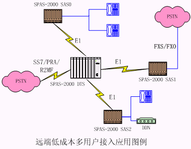 tyutSPAS-2000可編程交換機(jī)通過E1可以支持多個(gè)遠(yuǎn)端模塊。遠(yuǎn)端模塊采用SPAS-2000 SAS框,可以帶多種用戶接口:普通模擬用戶、DDN、環(huán)路中繼用戶;通過SPAS-2000 DTS對外提供各種信令接入。適合多點(diǎn)接入組網(wǎng),組網(wǎng)成本低廉。 在示意圖中,SAS表示遠(yuǎn)端用戶接入框,它可以通過需要選擇接入模擬用戶:FXO/FXS、E/M、普通模擬用戶和DDN。中心為SPAS可編程交換機(jī),可以通過 SS7/PRA/R2MF進(jìn)行匯接轉(zhuǎn)換。