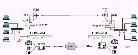 A網(wǎng)與B網(wǎng)分別為兩個(gè)局域網(wǎng),通過兩臺(tái)WavePoint II無線網(wǎng)橋?qū)蓚(gè)局域網(wǎng)連在一起,網(wǎng)橋上的RJ45口或BNC細(xì)纜接口與局域網(wǎng)相連。每臺(tái)網(wǎng)橋上插有一塊WaveLAN無線PC卡,PC卡的射頻輸出端口,通過饋線接到天線,通過PC卡來完成無線鏈路的連通。無線網(wǎng)橋連接完成后的效果類似HUB級(jí)連。IP語(yǔ)音網(wǎng)關(guān)-HGW-904的局域網(wǎng)接口(RJ45)連接到局域網(wǎng)的HUB上,根據(jù)用戶實(shí)際的話務(wù)量,選用Line端口接入用戶電話交換機(jī)(PBX),PBX接普通電話機(jī)和傳真機(jī),并連接至電話公網(wǎng)(PSTN)。其中所需設(shè)備:HGW-904 IP語(yǔ)音網(wǎng)關(guān)2臺(tái);PBX或電話機(jī)的配置可根據(jù)用戶實(shí)際需求;無線網(wǎng)橋2臺(tái);無線網(wǎng)卡2塊;天線兩套;饋線若干。 此方案亦可應(yīng)用于兩個(gè)需要連接的局域網(wǎng)之間有障礙物遮擋而不可視的情況。此時(shí)只需在水平或垂直方向?qū)ふ乙粋(gè)能同時(shí)看到A與B的位置,并在此位置加入中繼網(wǎng)橋,即可實(shí)現(xiàn)A網(wǎng)與B網(wǎng)的連接。實(shí)際應(yīng)用中,設(shè)置各異地IP語(yǔ)音網(wǎng)關(guān)的對(duì)應(yīng)代碼,在PBX上設(shè)定代表?yè)艽騃P電話的數(shù)字,代表PSTN外線電話的數(shù)字。此無線組網(wǎng)方式其實(shí)就是已有企業(yè)網(wǎng)的方式,可以完美解決特定地區(qū)布線的困難。特別是廣東地區(qū),工廠特別多,發(fā)展也特別快。有非常多的客戶可以用這種方式來滿足數(shù)據(jù)傳輸及VOIP的需求。