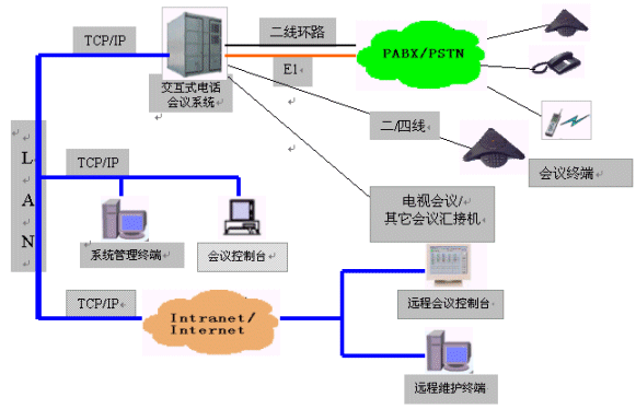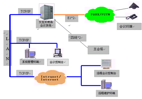 MCU-NT/I交互式電話會議系統(tǒng)為會議用戶提供了強大靈活的會議功能和豐富完善的網(wǎng)管功能。會議功能是在會議終端(或話機(jī))和會議控制臺上實現(xiàn)的;網(wǎng)管功能是在系統(tǒng)維護(hù)終端上實現(xiàn)的,并在靈活的組網(wǎng)方式中體現(xiàn)出它的方便易用。系統(tǒng)可以外接多個會議控制臺及多個系統(tǒng)維護(hù)終端,并且可以通過企業(yè)網(wǎng)或互聯(lián)網(wǎng)的遠(yuǎn)程連接,因此,所有功能都是可以遠(yuǎn)程實現(xiàn)的。