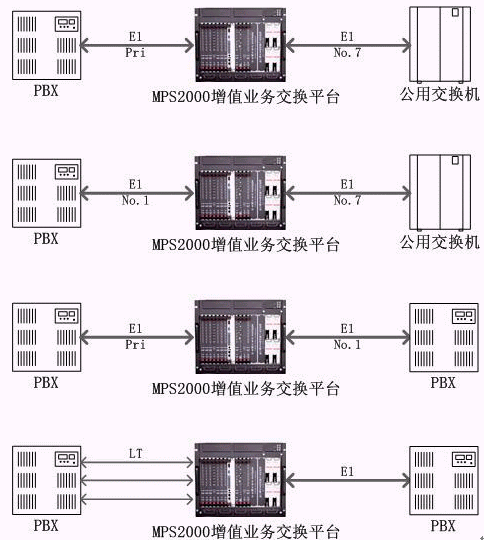 MPS2000-SG信令網(wǎng)關(guān)以MPS2000增值業(yè)務(wù)交換平臺為核心,配置支持不同信令的數(shù)字中繼板即可實現(xiàn)信令轉(zhuǎn)換的功能。