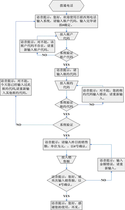 2) 系統(tǒng)每天從早上9:00--11:30為輸入工作時間,租戶在其它時間進入本系統(tǒng)時,系統(tǒng)自動播放"輸入銷售數(shù)據(jù)時間已過,請您在每天早上9:00--11:30間登錄系統(tǒng),謝謝您的使用,再見!"系統(tǒng)每天只能錄入前一天的銷售數(shù)據(jù),并對此進行提示。