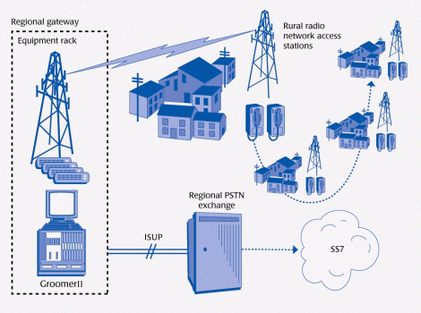 這里,每一本地-鄉(xiāng)村網(wǎng)絡(luò)里的"電話(huà)對(duì)"是通過(guò)Aculab公司的GroomerII與國(guó)內(nèi)電話(huà)網(wǎng)集成起來(lái)的。作為網(wǎng)絡(luò)的一個(gè)戰(zhàn)略要點(diǎn),GroomerII提供的E1鏈路可根據(jù)連接到的本地交換機(jī)的需要,運(yùn)行多種不同的協(xié)議,包括Q.931和ITU-T
