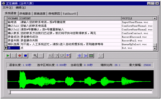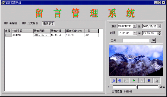 當(dāng)系統(tǒng)中無話務(wù)員登錄或等待超過20秒,則進(jìn)入語音信箱服務(wù)。語音信箱在進(jìn)入時(shí)提示用戶:“系統(tǒng)正忙,請(qǐng)留下您的聯(lián)系電話,復(fù)本機(jī)號(hào)請(qǐng)掛機(jī),復(fù)其他號(hào)碼請(qǐng)輸入電話號(hào)碼,按‘#’號(hào)鍵結(jié)束,或者在聽到‘嘟’的一聲之后留下你的留言”,當(dāng)主叫號(hào)碼位數(shù)不夠7位時(shí),提示:“系統(tǒng)正忙,請(qǐng)輸入您的聯(lián)系電話,按‘#’號(hào)鍵結(jié)束,或者在聽到‘嘟’的一聲之后留下你的留言”,系統(tǒng)將客戶留下的電話號(hào)碼記錄到數(shù)據(jù)庫中。將留言存放到一個(gè)指定目錄中,用話務(wù)號(hào)作為語音文件名。