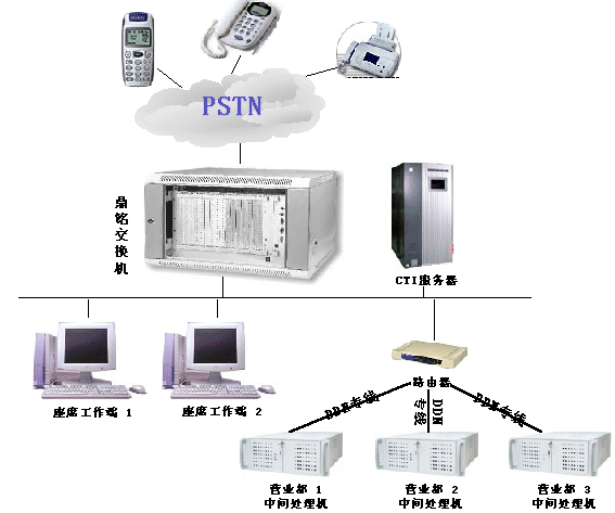 該系統(tǒng)總體來說就是,在一個地域中,相對集中的若干個營業(yè)部實行集中分布式統(tǒng)一管理,系統(tǒng)采用統(tǒng)一中繼號碼接入,支持現(xiàn)有的模擬線路、數(shù)字線路(中國一號信令、七號信令),實現(xiàn)統(tǒng)一座席管理,即所有座席功能集中在技術(shù)力量和業(yè)務力量較強的營業(yè)部或總部。