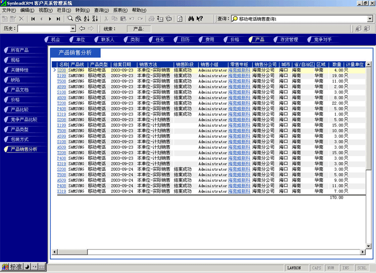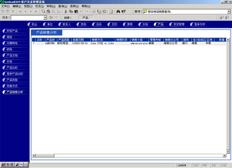管理人員可能需要對比產品銷售計劃與實際銷售的產品數量的關系,也有可能要對比某款產品與競爭產品銷售的情況,這時候可以利用產品銷售統(tǒng)計功能。它最大的好處是各項目數據普遍關聯,允許任意組合查詢條件(見圖4,點擊下圖,可彈出更清晰的大圖)