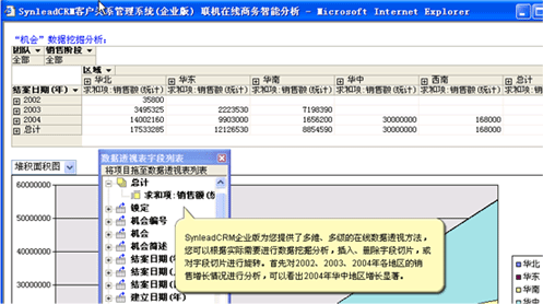 可以利用SynleadCRM企業(yè)版提供的在線聯機分析工具實現,也可以導出到EXCEL中,利用EXCEL的有關功能實現。OLAP在線聯機分析,屬于商業(yè)智能BI的組成部分之一,它允許您對數據進行任意的上鉆、下鉆,旋轉、切片、切塊,得到更豐富的、更有價值的圖表和報表。