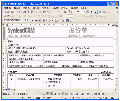 SynleadCRM企業(yè)版4.0很好地滿足了銷售自動化管理、服務(wù)自動化管理的上述需求,提供了開放的客戶化Word模板,使得用戶企業(yè)能夠根據(jù)實(shí)際情況不斷擴(kuò)展該應(yīng)用。客戶化模板直接在Word中編輯,可直觀、方便地插入合并域字段或代碼,只要對Word稍加了解就可勝任模板維護(hù)工作。