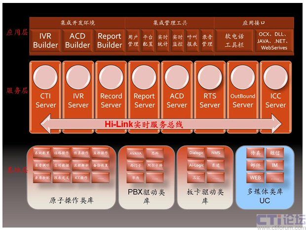在擁有第五代呼叫中心Hi-Link核心軟件的商路通公司看來,呼叫中心軟件架構(gòu)包含三層,基礎(chǔ)層、服務(wù)層和應(yīng)用層。而統(tǒng)一通信UC應(yīng)從劃入基礎(chǔ)層及服務(wù)層之中,PBX驅(qū)動(dòng)類庫和板卡驅(qū)動(dòng)類庫處理電話媒體的請(qǐng)求,而多媒體類庫用于處理其他統(tǒng)一通信的媒體,如傳真、短信、電子郵件、均包含在多媒體類庫之中。傳真、短信、電子郵件等請(qǐng)求分別由FAX SERVER、SMS SERVER 、E-mail SERVER處理。由ICC處理網(wǎng)上音頻、網(wǎng)上視頻、文本交談、文件傳輸、護(hù)航瀏覽、應(yīng)用共享、桌面共享和電子白板等媒體的請(qǐng)求。