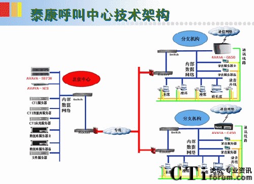 泰康電銷(xiāo)中心采用交換機(jī)+CTI+錄音+應(yīng)用系統(tǒng)組成。在中心點(diǎn)普遍采用交換機(jī)模式。當(dāng)中心點(diǎn)坐席規(guī)模大于60席位以數(shù)字中繼模式接入。當(dāng)分點(diǎn)新建數(shù)量不足60座席時(shí),采用遠(yuǎn)端模式,相應(yīng)采用交換機(jī)遠(yuǎn)端模塊+CTI+錄音+應(yīng)用系統(tǒng)組成。