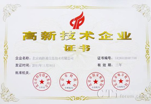 CTI論壇(ctiforum)3月23日消息(記者 浩宇):商路通再傳喜訊,2012年3月12日商路通獲得了“國家級高新技術(shù)企業(yè)”證書,(證書編號:GR201111001184,有效期三年),這標(biāo)志著商路通發(fā)展的又一個新的里程碑。