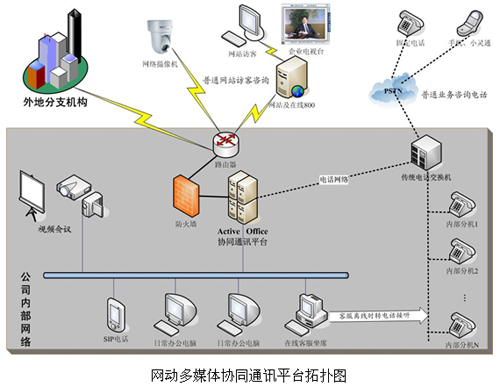 在上圖所示的Active Office客戶應(yīng)用圖中,網(wǎng)動(dòng)協(xié)同通訊平臺(tái)承擔(dān)了統(tǒng)一通信中心樞紐的作用,將語(yǔ)音、視頻、數(shù)據(jù)完美結(jié)合,使IP網(wǎng)絡(luò)與電話網(wǎng)絡(luò)、本地網(wǎng)絡(luò)與遠(yuǎn)程網(wǎng)絡(luò)互聯(lián)互通,在同一個(gè)平臺(tái)上交互協(xié)同。