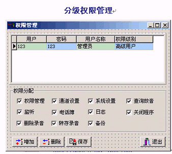 。。通話錄音或留言進(jìn)行查詢管理,可按日期、時間、電話號碼、線路、通話長度、人員等條件對錄音進(jìn)行快速檢索、播放,也可將錄音文件進(jìn)行刪除、標(biāo)記、轉(zhuǎn)存、備份等操作。分級權(quán)限管理